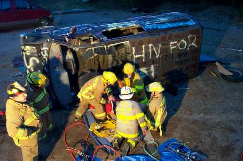 Chief Millix, EMT Plude, FF/EMT Soucy, and FF Harrison package the PT for transport to the Hospital. Lt. Karpuska and FF Forkey observe.